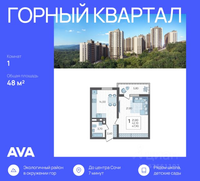 В продаже 1-комнатная квартира площадью 47.9, расположенная Литер 5 жилого комплекса комфорт+ класса "Горный квартал". Комплекс от девелопера AVA находится в Сочи, Хостинского района, в 15 минутах езды от центра города. Отличная транспортная доступность: Остановка маршрутных такси - 5 минут пешком, Барановский виадук - 10 минут на авто, Министерские озера - 2 минуты пешком, Гимназии, детские сады, фитнес-центры, супермаркеты, кинотеатр - 5-10 минут на авто, Ж/Д и автовокзал - 15-20 минут на авто, Адлер - 30 минут на авто, Аэропорт - 45 минут на авто. Аккуратный облик домов Жилой комплекс состоит из пяти корпусов высотой от 10 до 16 этажей. Сдержанные фасады в бежево-серых оттенках выглядят аккуратно и гармонируют с природным окружением, а открытые балконы добавляют облику домов легкости. Контейнеры под кондиционеры встроены в фасады и практически незаметны, благодаря чему дома сохраняют опрятный внешний вид. Комплекс расположен на склоне горы, поэтому из окон квартир на верхних этажах открываются отличные панорамные виды на лес, озеро и город: чем выше этаж, тем выразительнее пейзаж. Двор, где есть место для всех На внутренней территории комплекса всем будет приятно и интересно проводить время в любой сезон. Здесь есть беседки и гамаки под теневыми навесами, что особенно удобно для отдыха в жаркие или дождливые дни. Для активных жителей предусмотрены спортивные площадки и уличные тренажеры, для детей - игровые площадки из натуральных материалов, а для семей и компаний - зона барбекю. Особое преимущество - кинотеатр под открытым небом: формат редкий для жилых комплексов и особенно ценный для совместного семейного досуга прямо рядом с домом. Во всем дворе - ландшафтное озеленение: высажены разнообразные деревья и кустарники, южные цветы и газоны. Природное окружение и идеальная экология Локация особенно понравится тем, кто любит природу и ведет активный образ жизни. Всего в 2 минутах ходьбы находится Нижнее Министерское озеро - отличное место для прогулок и отдыха. Поблизости расположены природные достопримечательности южного побережья, включая Черепашье озеро и дольмены, куда интересно ходить в походы или выезжать на выходные. До общественных и санаторных пляжей можно добраться за 20 минут на автомобиле. Благодаря хвойному лесу и мягкому морскому бризу здесь всегда чистый воздух, а ночами видно звездное небо, что подчеркивает горный характер места и создает редкое ощущение тишины и уюта для Сочи. Дополнительные преимущества Видовые квартиры с окнами на три стороны света и семейные форматы с тремя спальнями, двумя ванными и отдельной кухней; Наземный паркинг для жителей и гостей на 815 машиномест, На первых этажах домов работают магазины, рестораны и салоны красоты, к которым можно спуститься на лифте, Комфортно не только отдыхать, но и полноценно жить всей семьей: гимназии в 10 минутах езды, удобная дорогая до города, магазины и сервисы поблизости.