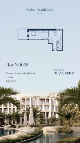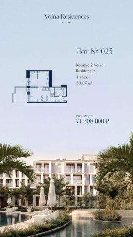 Продаётся 1-комнатная квартира в строящемся доме (Дом 1 ), срок сдачи: II-кв. 2028, общей площадью 32.72 кв.м., на 2 этаже. Volna Residence - это комплекс для жизни на территории комплекса Volna, объединённый с отелем общей концепцией и инфраструктурой. 3 малоэтажных корпуса на 520 номеров расположены на первой береговой линии и имеют собственный бассейн. Территория комплекса Volna - 7,2 га. Более половины этой территории занимает парк и инфраструктура для жизни и отдыха.