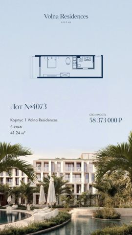 Продаётся 1-комнатная квартира в строящемся доме (Дом 2), срок сдачи: II-кв. 2028, общей площадью 45.66 кв.м., на 2 этаже. Volna Residence - это комплекс для жизни на территории комплекса Volna, объединённый с отелем общей концепцией и инфраструктурой. 3 малоэтажных корпуса на 520 номеров расположены на первой береговой линии и имеют собственный бассейн. Территория комплекса Volna - 7,2 га. Более половины этой территории занимает парк и инфраструктура для жизни и отдыха.