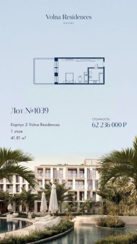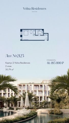 Продаётся 1-комнатная квартира в строящемся доме (Дом 3), срок сдачи: II-кв. 2028, общей площадью 30.34 кв.м., на 2 этаже. Volna Residence - это комплекс для жизни на территории комплекса Volna, объединённый с отелем общей концепцией и инфраструктурой. 3 малоэтажных корпуса на 520 номеров расположены на первой береговой линии и имеют собственный бассейн. Территория комплекса Volna - 7,2 га. Более половины этой территории занимает парк и инфраструктура для жизни и отдыха.
