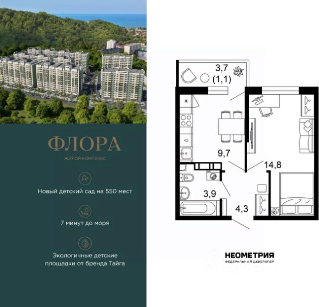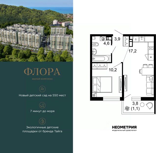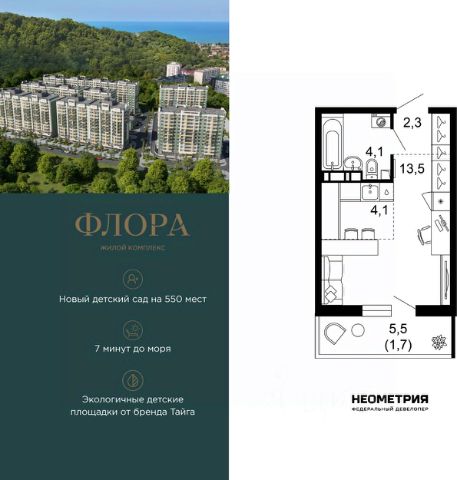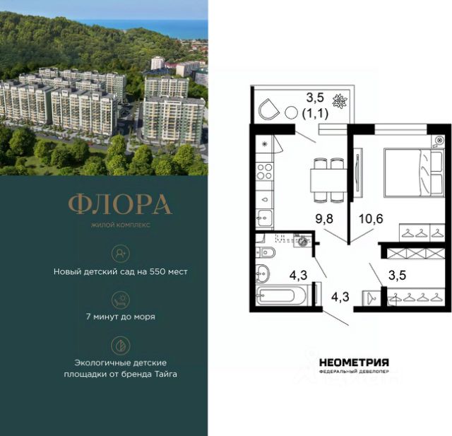 Продается квартира в ЖК "Флора" от федерального девелопера "Неометрия". Это жилой комплекс комфорт-класса в самом зеленом районе Сочи. При проектировании постарались максимально сохранить окружающую флору и фауну. Теплое море, горы, целебные источники, река, близость заповедника все это уже рядом с вами.