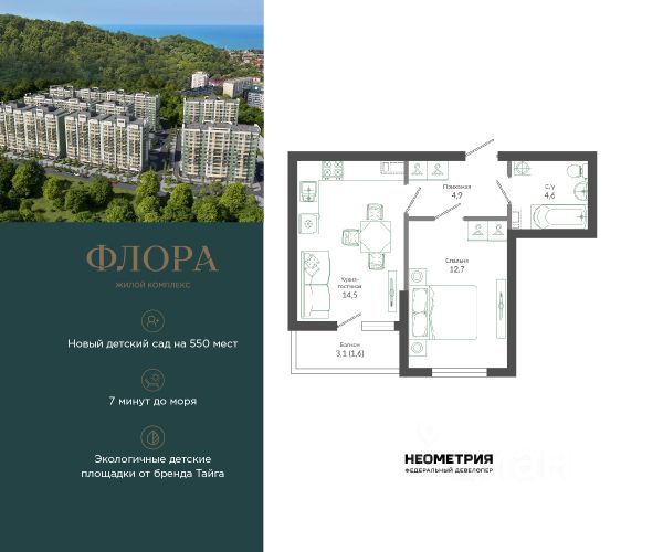 Продается квартира в ЖК "Флора" от федерального девелопера "Неометрия". Это жилой комплекс комфорт-класса в самом зеленом районе Сочи. При проектировании постарались максимально сохранить окружающую флору и фауну. Теплое море, горы, целебные источники, река, близость заповедника все это уже рядом с вами. Жилой комплекс "Флора" это: • 4,5 Га благоустроенной территории от дизайн-бюро Cora * 7 минут до моря на машине • Современные экологичные детские площадки от бренда "Тайга" • Яркие аллеи с цветниками и кустарниками для прогулок и утренних пробежек • Благоустроенная набережная с шезлонгами и перголами • Спортивные зоны для любителей пляжного волейбола, бадминтона и йоги - лапомоечные и колясочные в каждом подъезде - подземный паркинг на 429 мест Собственная управляющая компания с функцией "доверительного управления" Кудепста это прекрасный зеленый оазис, который расположился между историческим центром Сочи и Адлером. Благодаря выгодному местоположению ЖК "Флора" между курортным Адлером и центром Сочи до самых популярных социальных, культурных и развлекательных объектов города можно добраться за считанные минуты: Олимпийский парк. Красная Поляна, аэропорт, жд-вокзал. Кроме того, в шаговой доступности расположена вся необходимая социальная инфраструктура, что удобно для жизни всех членов семьи: • 2 школы; • 3 детских сада; • 3 поликлиники; • 2 фитнес-центра; • 3 магазина и гипермаркета; • спортивная школа • 2 остановки общественного транспорта. На первых этажах комплекса расположены коммерческие помещения пункты выдачи маркетплейсов, кофейни, магазины. В жилом комплексе соблюден принцип сбалансированных и эргономичных планировочных решений: от компактных студий до просторных семейных квартир. В каждой квартире есть балкон, и установлены увеличенные оконные рамы. На 12 этаже повышенной комфортности открываются потрясающие виды на море и национальный парк благодаря панорамному остеклению лоджий. Квартиру можно купить с черновой отделкой или с готовым ремонтом "Прайм", а также с сертификатом на покупку мебели. Приобрести квартиру можно за наличную оплату, в ипотеку, с привлечением средства маткапитала. #26B05u
