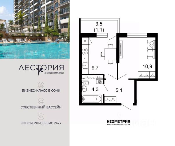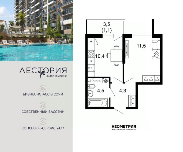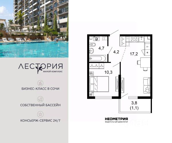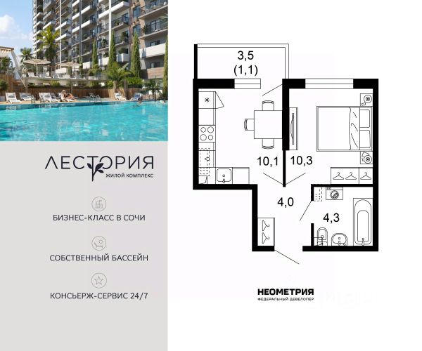 Продается квартира в жилом комплексе бизнес-класса "Лестория". В составе ЖК предусмотрена собственная аквазона площадью 473 квадратных метра с двумя подогреваемыми бассейнами, что соответствуют стандартам бизнес-класса. Аквазона объединяет взрослый и детский бассейны. В welcome-zone к услугам посетителей шезлонги и все необходимые принадлежности. Раздевалки с душевыми комнатами, инфракрасная сауна — здесь все предусмотрено для комфортного отдыха и полного расслабления. Для водного комплекса продуман отдельный вход, оборудованный системой контроля и управления доступом (СКУД). Аквазона только часть уникальной инфраструктуры "Лестории", которая включает в себя также благоустроенную территорию с пятьюдесятью функциональными зонами для прогулок, отдыха и занятий спортом, видовые террасы на крышах для отдыха, работы и встреч с друзьями, а также пространство набережной Кудепсты с шезлонгами и перголами. Жилой комплекс "Лестория" состоит из шести домов высотностью от 15 до 17 этажей, окружённых зеленым массивом национального парка. На придомовой территории для жителей предусмотрены закрытые дворы с круглосуточным видеонаблюдением, активити-центр для детей и подростков, тихие зоны для отдыха и медитации. На крышах домов будут созданы зеленые террасы для наслаждения прекрасными видами на море и горы. В проекте предусмотрены разные варианты отделки квартир под потребности покупателей. Тем, кто хочет воплотить в жизнь собственные интерьерные задумки, подойдут квартиры без ремонта. Для комфортной жизни и отдыха в комплексе будет работать круглосуточный консьерж-сервис уровня 5*, который с легкостью закроет все ежедневные потребности: от заказа продуктов и встречи гостей в аэропорту до выгула и дрессировки питомца. К услугам жителей ЖК "Лестория" — собственная управляющая компания, для инвесторов предоставляются услуги доверительного управления. #Z6A6cb