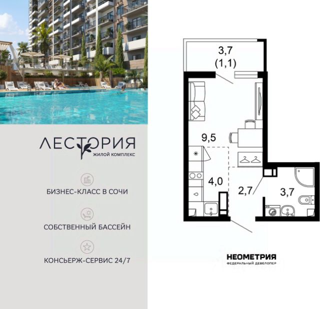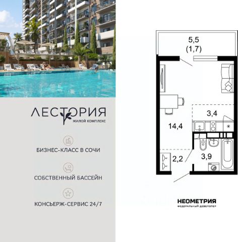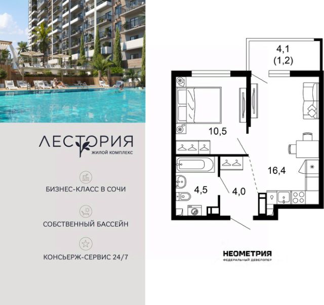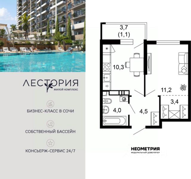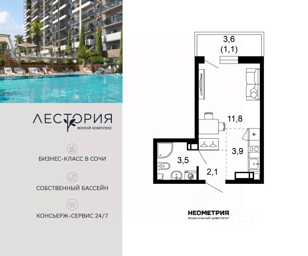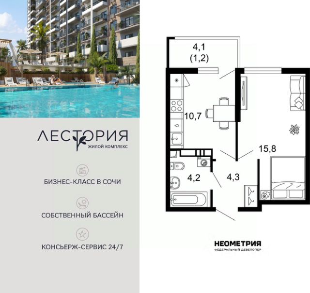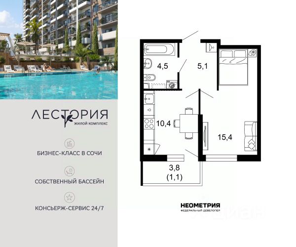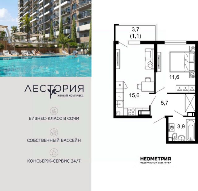 Продается квартира в жилом комплексе бизнес-класса "Лестория". В составе ЖК предусмотрена собственная аквазона площадью 473 квадратных метра с двумя подогреваемыми бассейнами, что соответствуют стандартам бизнес-класса. Аквазона объединяет взрослый и детский бассейны. В welcome-zone к услугам посетителей шезлонги и все необходимые принадлежности. Раздевалки с душевыми комнатами, инфракрасная сауна — здесь все предусмотрено для комфортного отдыха и полного расслабления. Для водного комплекса продуман отдельный вход, оборудованный системой контроля и управления доступом (СКУД). Аквазона только часть уникальной инфраструктуры "Лестории", которая включает в себя также благоустроенную территорию с пятьюдесятью функциональными зонами для прогулок, отдыха и занятий спортом, видовые террасы на крышах для отдыха, работы и встреч с друзьями, а также пространство набережной Кудепсты с шезлонгами и перголами. Жилой комплекс "Лестория" состоит из шести домов высотностью от 15 до 17 этажей, окружённых зеленым массивом национального парка. На придомовой территории для жителей предусмотрены закрытые дворы с круглосуточным видеонаблюдением, активити-центр для детей и подростков, тихие зоны для отдыха и медитации. На крышах домов будут созданы зеленые террасы для наслаждения прекрасными видами на море и горы. В проекте предусмотрены разные варианты отделки квартир под потребности покупателей. Тем, кто хочет воплотить в жизнь собственные интерьерные задумки, подойдут квартиры без ремонта. Для комфортной жизни и отдыха в комплексе будет работать круглосуточный консьерж-сервис уровня 5*, который с легкостью закроет все ежедневные потребности: от заказа продуктов и встречи гостей в аэропорту до выгула и дрессировки питомца. К услугам жителей ЖК "Лестория" — собственная управляющая компания, для инвесторов предоставляются услуги доверительного управления. #Z6FclB