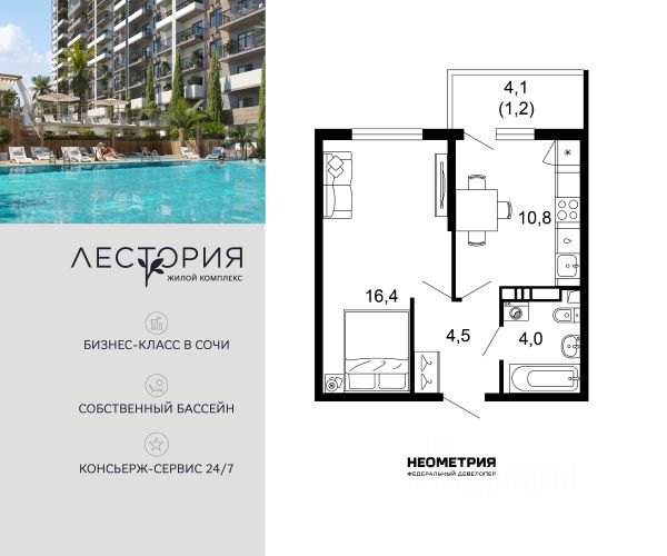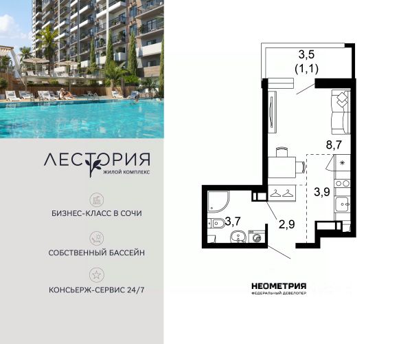 Продается квартира в жилом комплексе бизнес-класса "Лестория". В составе ЖК предусмотрена собственная аквазона площадью 473 квадратных метра с двумя подогреваемыми бассейнами, что соответствуют стандартам бизнес-класса. Аквазона объединяет взрослый и детский бассейны. В welcome-zone к услугам посетителей шезлонги и все необходимые принадлежности. Раздевалки с душевыми комнатами, инфракрасная сауна — здесь все предусмотрено для комфортного отдыха и полного расслабления. Для водного комплекса продуман отдельный вход, оборудованный системой контроля и управления доступом (СКУД). Аквазона только часть уникальной инфраструктуры "Лестории", которая включает в себя также благоустроенную территорию с пятьюдесятью функциональными зонами для прогулок, отдыха и занятий спортом, видовые террасы на крышах для отдыха, работы и встреч с друзьями, а также пространство набережной Кудепсты с шезлонгами и перголами. Жилой комплекс "Лестория" состоит из шести домов высотностью от 15 до 17 этажей, окружённых зеленым массивом национального парка. На придомовой территории для жителей предусмотрены закрытые дворы с круглосуточным видеонаблюдением, активити-центр для детей и подростков, тихие зоны для отдыха и медитации. На крышах домов будут созданы зеленые террасы для наслаждения прекрасными видами на море и горы. В проекте предусмотрены разные варианты отделки квартир под потребности покупателей. Тем, кто хочет воплотить в жизнь собственные интерьерные задумки, подойдут квартиры без ремонта. Для комфортной жизни и отдыха в комплексе будет работать круглосуточный консьерж-сервис уровня 5*, который с легкостью закроет все ежедневные потребности: от заказа продуктов и встречи гостей в аэропорту до выгула и дрессировки питомца. К услугам жителей ЖК "Лестория" — собственная управляющая компания, для инвесторов предоставляются услуги доверительного управления.
