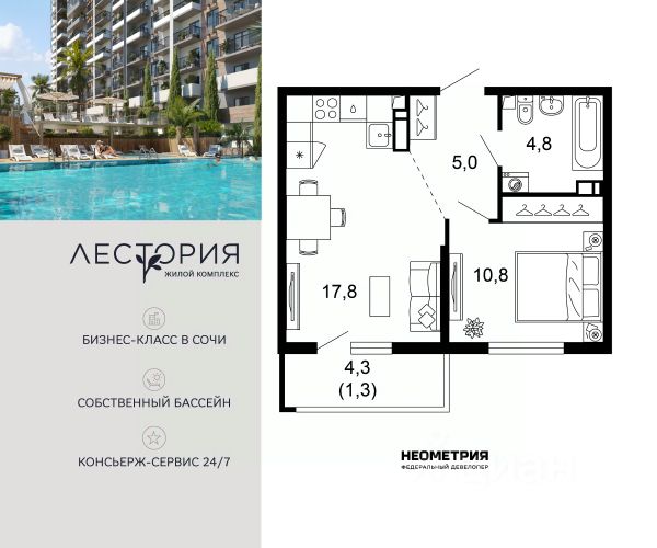 Продается квартира в жилом комплексе бизнес-класса "Лестория". В составе ЖК предусмотрена собственная аквазона площадью 473 квадратных метра с двумя подогреваемыми бассейнами, что соответствуют стандартам бизнес-класса. Аквазона объединяет взрослый и детский бассейны. В welcome-zone к услугам посетителей шезлонги и все необходимые принадлежности. Раздевалки с душевыми комнатами, инфракрасная сауна — здесь все предусмотрено для комфортного отдыха и полного расслабления. Для водного комплекса продуман отдельный вход, оборудованный системой контроля и управления доступом (СКУД). Аквазона только часть уникальной инфраструктуры "Лестории", которая включает в себя также благоустроенную территорию с пятьюдесятью функциональными зонами для прогулок, отдыха и занятий спортом, видовые террасы на крышах для отдыха, работы и встреч с друзьями, а также пространство набережной Кудепсты с шезлонгами и перголами. Жилой комплекс "Лестория" состоит из шести домов высотностью от 15 до 17 этажей, окружённых зеленым массивом национального парка. На придомовой территории для жителей предусмотрены закрытые дворы с круглосуточным видеонаблюдением, активити-центр для детей и подростков, тихие зоны для отдыха и медитации. На крышах домов будут созданы зеленые террасы для наслаждения прекрасными видами на море и горы. В проекте предусмотрены разные варианты отделки квартир под потребности покупателей. Тем, кто хочет воплотить в жизнь собственные интерьерные задумки, подойдут квартиры без ремонта. Для комфортной жизни и отдыха в комплексе будет работать круглосуточный консьерж-сервис уровня 5*, который с легкостью закроет все ежедневные потребности: от заказа продуктов и встречи гостей в аэропорту до выгула и дрессировки питомца. К услугам жителей ЖК "Лестория" — собственная управляющая компания, для инвесторов предоставляются услуги доверительного управления. #zmAV9c