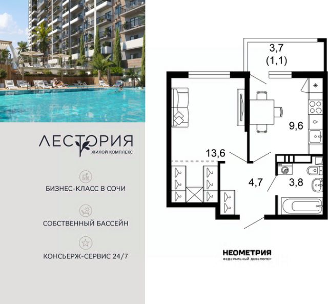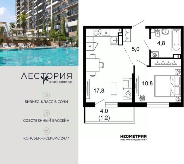 В продаже 1-комнатная квартира, площадью 38.14, расположенная Литер 10 жилого комплекса бизнес-класса "Кислород". Комплекс от девелопера AVA находится в Сочи, на северном склоне горы Бытха, в 7 минутах езды от центра города. Отличная транспортная доступность Остановка автобусов и маршрутных такси - 6 минут пешком, Курортный проспект и пляжи - 10 минут на авто, Эко-парк "Быхта" и туристические тропы - 5 минут пешком, Школы, детские сады, поликлиники, супермаркеты - 5-10 минут на авто, Ж/Д вокзал и центр города - 15 минут на транспорте, Аэропорт - 30 минут на авто. Аккуратный облик домов Жилой комплекс состоит из 15 корпусов высотой 19 этажей. Светлые фасады с голубыми акцентами и архитектурной подсветкой лучше отражают солнце и визуально не перегружают застройку. Благодаря расположению на склоне, из квартир открываются широкие панорамы, в том числе на море и эко-парк. Безопасный двор В комплексе благоустроенная территория организована как безопасное и многофункциональное пространство, где найдется место каждому. Дворы закрыты от автомобилей и прохожих, поэтому здесь тихо и безопасно для детей. На территории предусмотрены игровые площадки для детей разных возрастов, спортивное поле для футбола и баскетбола, а также уличные тренажеры - заниматься спортом можно рядом с домом, без поездок в фитнес-клуб. Для спокойного отдыха предусмотрены зоны со скамейками и прогулочные дорожки по всей территории комплекса. Собственный парк В 5 минутах ходьбы от домов будет благоустроен экологический парк "Бытха" с прогулочными, спортивными, образовательными и экстремальными маршрутами, а также детскими и спортивными площадками. Там можно интересно проводить время с детьми и друзьями, выходить на пробежку или тренировку, гулять и заниматься с питомцем. Преимущества Квартиры европланировок с двумя балконами, гардеробными и видами на несколько сторон света, Подземная, многоуровневая и наземная парковки для автомобилей жителей и гостей, Комфортно не только отдыхать, но и полноценно жить всей семьей: детские сады и школы в 5 минутах, удобная дорогая до города, магазины и сервисы поблизости.