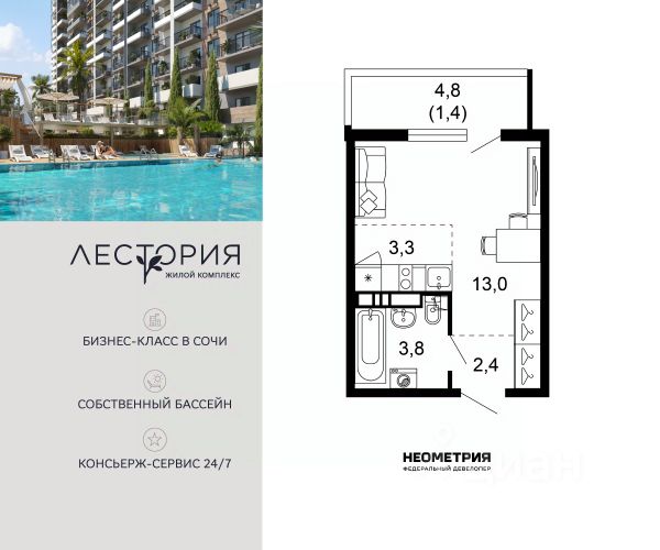 Продается квартира в жилом комплексе бизнес-класса "Лестория". В составе ЖК предусмотрена собственная аквазона площадью 473 квадратных метра с двумя подогреваемыми бассейнами, что соответствуют стандартам бизнес-класса. Аквазона объединяет взрослый и детский бассейны. В welcome-zone к услугам посетителей шезлонги и все необходимые принадлежности. Раздевалки с душевыми комнатами, инфракрасная сауна — здесь все предусмотрено для комфортного отдыха и полного расслабления. Для водного комплекса продуман отдельный вход, оборудованный системой контроля и управления доступом (СКУД). Аквазона только часть уникальной инфраструктуры "Лестории", которая включает в себя также благоустроенную территорию с пятьюдесятью функциональными зонами для прогулок, отдыха и занятий спортом, видовые террасы на крышах для отдыха, работы и встреч с друзьями, а также пространство набережной Кудепсты с шезлонгами и перголами. Жилой комплекс "Лестория" состоит из шести домов высотностью от 15 до 17 этажей, окружённых зеленым массивом национального парка. На придомовой территории для жителей предусмотрены закрытые дворы с круглосуточным видеонаблюдением, активити-центр для детей и подростков, тихие зоны для отдыха и медитации. На крышах домов будут созданы зеленые террасы для наслаждения прекрасными видами на море и горы. В проекте предусмотрены разные варианты отделки квартир под потребности покупателей. Тем, кто хочет воплотить в жизнь собственные интерьерные задумки, подойдут квартиры без ремонта. Для комфортной жизни и отдыха в комплексе будет работать круглосуточный консьерж-сервис уровня 5*, который с легкостью закроет все ежедневные потребности: от заказа продуктов и встречи гостей в аэропорту до выгула и дрессировки питомца. К услугам жителей ЖК "Лестория" — собственная управляющая компания, для инвесторов предоставляются услуги доверительного управления.