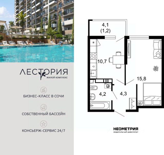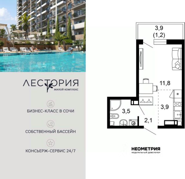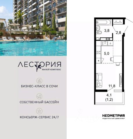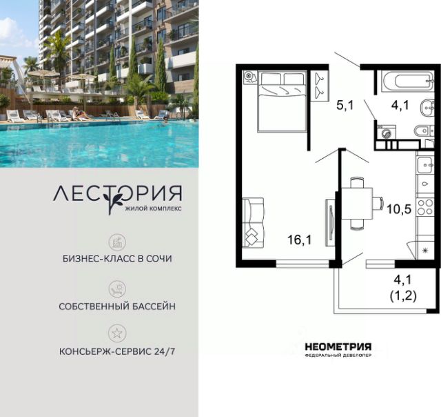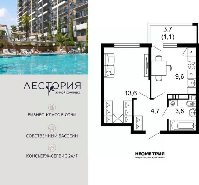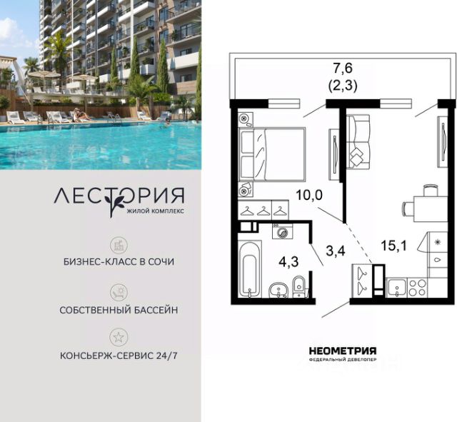 Продается квартира в жилом комплексе бизнес-класса "Лестория". В составе ЖК предусмотрена собственная аквазона площадью 473 квадратных метра с двумя подогреваемыми бассейнами, что соответствуют стандартам бизнес-класса. Аквазона объединяет взрослый и детский бассейны. В welcome-zone к услугам посетителей шезлонги и все необходимые принадлежности. Раздевалки с душевыми комнатами, инфракрасная сауна — здесь все предусмотрено для комфортного отдыха и полного расслабления. Для водного комплекса продуман отдельный вход, оборудованный системой контроля и управления доступом (СКУД). Аквазона только часть уникальной инфраструктуры "Лестории", которая включает в себя также благоустроенную территорию с пятьюдесятью функциональными зонами для прогулок, отдыха и занятий спортом, видовые террасы на крышах для отдыха, работы и встреч с друзьями, а также пространство набережной Кудепсты с шезлонгами и перголами. Жилой комплекс "Лестория" состоит из шести домов высотностью от 15 до 17 этажей, окружённых зеленым массивом национального парка. На придомовой территории для жителей предусмотрены закрытые дворы с круглосуточным видеонаблюдением, активити-центр для детей и подростков, тихие зоны для отдыха и медитации. На крышах домов будут созданы зеленые террасы для наслаждения прекрасными видами на море и горы. В проекте предусмотрены разные варианты отделки квартир под потребности покупателей. Тем, кто хочет воплотить в жизнь собственные интерьерные задумки, подойдут квартиры без ремонта. Для комфортной жизни и отдыха в комплексе будет работать круглосуточный консьерж-сервис уровня 5*, который с легкостью закроет все ежедневные потребности: от заказа продуктов и встречи гостей в аэропорту до выгула и дрессировки питомца. К услугам жителей ЖК "Лестория" — собственная управляющая компания, для инвесторов предоставляются услуги доверительного управления. #Z70469