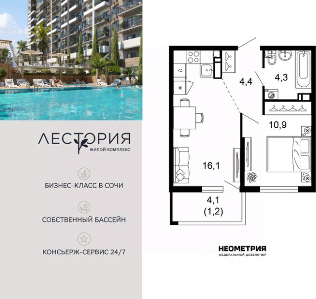 Продается квартира в жилом комплексе бизнес-класса "Лестория". В составе ЖК предусмотрена собственная аквазона площадью 473 квадратных метра с двумя подогреваемыми бассейнами, что соответствуют стандартам бизнес-класса. Аквазона объединяет взрослый и детский бассейны. В welcome-zone к услугам посетителей шезлонги и все необходимые принадлежности. Раздевалки с душевыми комнатами, инфракрасная сауна — здесь все предусмотрено для комфортного отдыха и полного расслабления. Для водного комплекса продуман отдельный вход, оборудованный системой контроля и управления доступом (СКУД). Аквазона только часть уникальной инфраструктуры "Лестории", которая включает в себя также благоустроенную территорию с пятьюдесятью функциональными зонами для прогулок, отдыха и занятий спортом, видовые террасы на крышах для отдыха, работы и встреч с друзьями, а также пространство набережной Кудепсты с шезлонгами и перголами. Жилой комплекс "Лестория" состоит из шести домов высотностью от 15 до 17 этажей, окружённых зеленым массивом национального парка. На придомовой территории для жителей предусмотрены закрытые дворы с круглосуточным видеонаблюдением, активити-центр для детей и подростков, тихие зоны для отдыха и медитации. На крышах домов будут созданы зеленые террасы для наслаждения прекрасными видами на море и горы. В проекте предусмотрены разные варианты отделки квартир под потребности покупателей. Тем, кто хочет воплотить в жизнь собственные интерьерные задумки, подойдут квартиры без ремонта. Для комфортной жизни и отдыха в комплексе будет работать круглосуточный консьерж-сервис уровня 5*, который с легкостью закроет все ежедневные потребности: от заказа продуктов и встречи гостей в аэропорту до выгула и дрессировки питомца. К услугам жителей ЖК "Лестория" — собственная управляющая компания, для инвесторов предоставляются услуги доверительного управления. #ztoE2t Купить квартиру евродвушку в новостройке в Сочи.