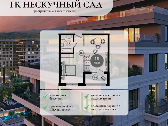 Проект представляет собой 2 дома высотой в 10 этажей. В облицовке стен корпусов используется энергоэффективный навесной вентилируемый фасад. Во всех домах выполнена дизайнерская отделка входных групп и установлены современные лифты. В проекте предложено множество планировочных решений: в наличии апартаменты, как классического типа, так и европланировки. Сдаются они без отделки и высотой потолков от 2.7 метров. Из окон номеров гостиничного комплекса "Нескучный сад" открывается неповторимый вид на горные вершины и Черное море. На внутренней закрытой территории проекта выполнен ландшафтный дизайн. Инфраструктура комплекса включает в себя: зону отдыха с просторным бассейном на открытом воздухе, современный SPA-комплекс с широким спектром косметических и оздоровительных процедур, просторный тренажерный зал с оборудованием, отвечающим высоким мировым стандартам, круглосуточный ресепшн и услуги консьерж-сервиса для решения любых задач 24/7, бутики известных брендов и ресторан. Для детей предусмотрен Детский центр с разнообразными развивающими и развлекательными программами. На территории комплекса спроектирован подземный паркинг с профессиональными парковщиками и видеонаблюдением. Проект расположен в Хостинском районе. Инфраструктура развита, в пешей доступности: магазины, кафе, банкоматы, медицинские учреждения, школы, детские сады. За 15 минут транспортом можно добраться до международного аэропорта Сочи, 30 минут до центральной набережной, 45 минут до курорта Красная Поляна. Продам 1-комнатную квартиру в ипотеку в жилом районе Адлер в городе Сочи.