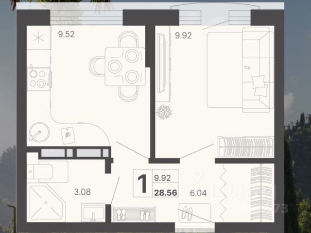 Полноценная 1к квартира с двумя окнами, распланирована на прихожую, спальню, кухню, гардеробную, санузел.