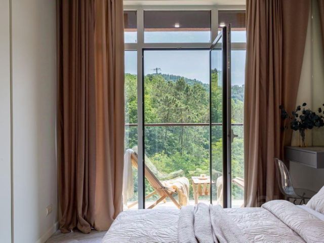 Из квартиры открывается роскошный вид на зелень. Тихая сторона комплекса. До моря и одного из лучших пляжей г. Сочи всего 15 минут пешком.