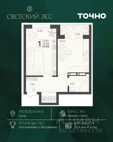 Жилой комплекс состоит из 7 домов переменной этажности от 11 до 20 этажей. В холлах и вестибюлях выполнена дизайнерская отделка, установлены скоростные лифты. На 1 этажах расположены зоны ожидания и колясочные. В проекте предложено множество планировочных решений: в наличии квартиры классического типа. Сдаются они с подчистовой отделкой, панорамными окнами и высотой потолков в 3м. Некоторые квартиры имеют вид на лесной массив и горы. На закрытой территории комплекса выполнен ландшафтный дизайн, установлены безопасные детские площадки для детей всех возрастов, места для отдыха, зоны барбекю с беседками, спортивные площадки, установлен открытый бассейн. На территории также оборудована своя набережная протяженностью в 1,2км. Для владельцев автомобилей предусмотрен отдельный многоуровневый паркинг. Жилой комплекс располагается в активно развивающемся Хостинском районе. В нескольких минутах ходьбы находятся поликлиники, школы, детские сады, кинотеатр, магазины и кафе. До центра Сочи можно добраться за 30 минут транспортом. 1-комнатная квартира в микрорайоне КСМ в городе Сочи.