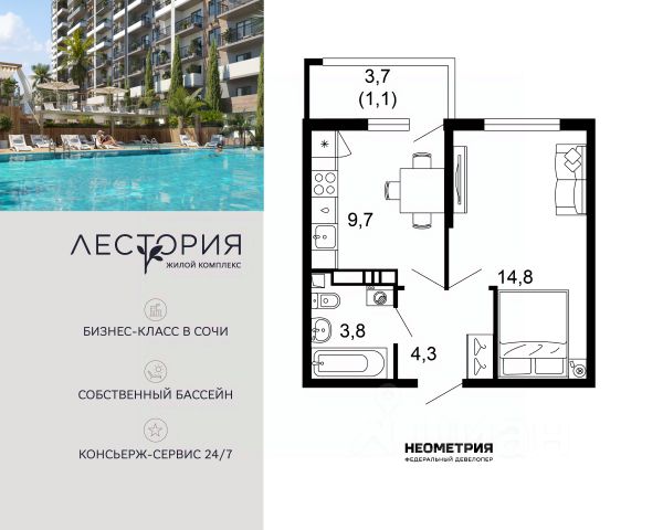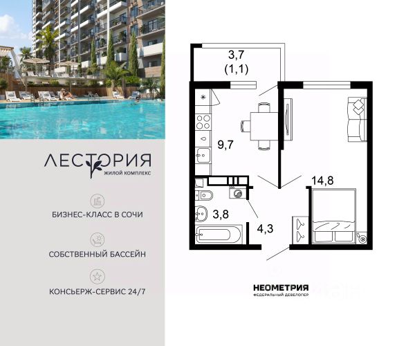 Продается квартира в жилом комплексе бизнес-класса "Лестория". В составе ЖК предусмотрена собственная аквазона площадью 473 квадратных метра с двумя подогреваемыми бассейнами, что соответствуют стандартам бизнес-класса. Аквазона объединяет взрослый и детский бассейны. В welcome-zone к услугам посетителей шезлонги и все необходимые принадлежности. Раздевалки с душевыми комнатами, инфракрасная сауна — здесь все предусмотрено для комфортного отдыха и полного расслабления. Для водного комплекса продуман отдельный вход, оборудованный системой контроля и управления доступом (СКУД). Аквазона только часть уникальной инфраструктуры "Лестории", которая включает в себя также благоустроенную территорию с пятьюдесятью функциональными зонами для прогулок, отдыха и занятий спортом, видовые террасы на крышах для отдыха, работы и встреч с друзьями, а также пространство набережной Кудепсты с шезлонгами и перголами. Жилой комплекс "Лестория" состоит из шести домов высотностью от 15 до 17 этажей, окружённых зеленым массивом национального парка. На придомовой территории для жителей предусмотрены закрытые дворы с круглосуточным видеонаблюдением, активити-центр для детей и подростков, тихие зоны для отдыха и медитации. На крышах домов будут созданы зеленые террасы для наслаждения прекрасными видами на море и горы. В проекте предусмотрены разные варианты отделки квартир под потребности покупателей. Тем, кто хочет воплотить в жизнь собственные интерьерные задумки, подойдут квартиры без ремонта. Для комфортной жизни и отдыха в комплексе будет работать круглосуточный консьерж-сервис уровня 5*, который с легкостью закроет все ежедневные потребности: от заказа продуктов и встречи гостей в аэропорту до выгула и дрессировки питомца. К услугам жителей ЖК "Лестория" — собственная управляющая компания, для инвесторов предоставляются услуги доверительного управления. #26aaID