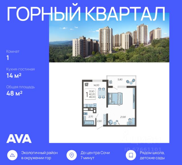 В продаже 1-комнатная квартира площадью 48, расположенная Литер 6 жилого комплекса комфорт+ класса "Горный квартал". Комплекс от девелопера AVA находится в Сочи, Хостинского района, в 15 минутах езды от центра города.