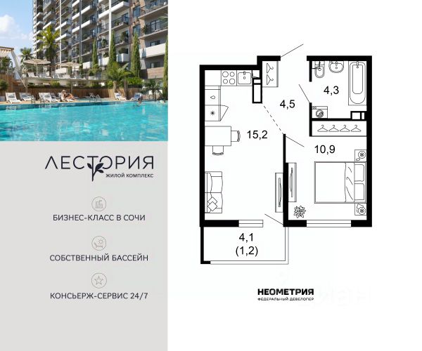 Проект включает в себя 7 жилых корпусов высотой 12 этажей. В подъездах выполнена дизайнерская отделка в светлой цветовой гамме с яркими акцентами, для удобства жителей в местах общего пользования предусмотрена навигация. В каждой секции предусмотрены помещения для хранения велосипедов и колясок с обустроенным местом для мойки колес и лап домашних животных. Покупателям в ЖК предложено множество планировочных решений: в наличии квартиры, как классического типа, так и европланировки. Из окон открываются виды на реку и горы. Квартиры сдаются без отделки. В состав комплекса входит школа на 2 000 мест, детский сад на 550 мест и фитнес-центр. На первых этажах расположены коммерческие помещения. Во дворах установлены детские площадки, спортивные комплексы и деревянные беседки для отдыха. По периметру ЖК ведется видеонаблюдение, к которому можно подключится online при помощи специального приложения для мобильных устройств. Рядом с комплексом располагается благоустроенная набережная реки Кудепста. Комплекс расположен в микрорайоне Кудепста города Сочи. В окрестностях района находится большая плантация пробкового дуба. В пешей доступности есть школы, детские сады, магазины, медучреждения, салоны красоты и места для отдыха. Комплекс расположен в 1,9 км от моря, и 7 км до Сочи. Продам 1-комнатную квартиру в жилом комплексе с кухней гостиной в Сочи.