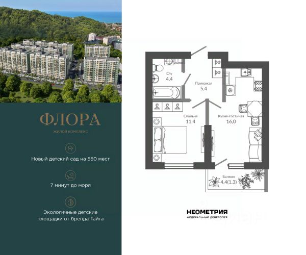 Продается квартира в ЖК "Флора" от федерального девелопера "Неометрия". Это жилой комплекс комфорт-класса в самом зеленом районе Сочи. При проектировании постарались максимально сохранить окружающую флору и фауну. Теплое море, горы, целебные источники, река, близость заповедника все это уже рядом с вами.