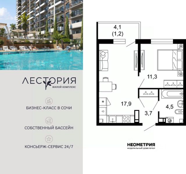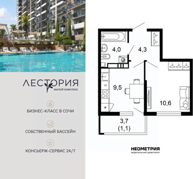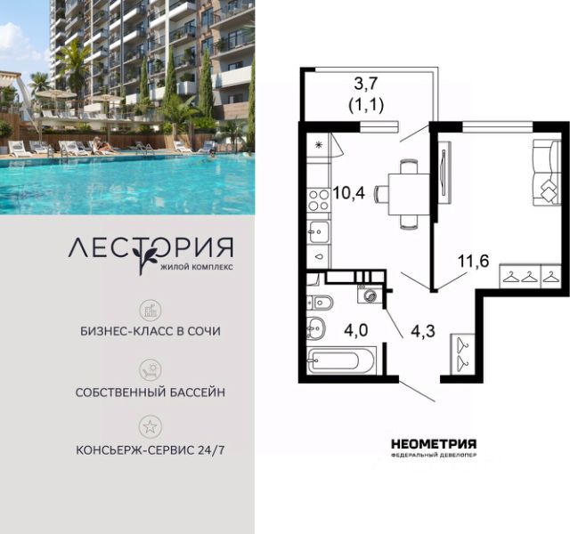 Комплекс апартаментов представлен всесезонным курортным отелем бизнес-класса из 10 домов высотой 3 и 4 этажа. Здания выполнены по монолитной технологии с комбинированными фасадами. Внутри предусмотрен круглосуточный ресепшен для комфорта жильцов. В проекте представлены апартаменты площадью от 19 до 45 кв. м с мастер-спальнями, каминами, панорамными окнами и потолками 3,15 м. Все квартиры имеют балконы с видом на горы. Помещения передаются без отделки с возможностью дозаказать комплектацию с мягкой мебелью. Предусмотрена возможность объединения соседних апартаментов. На территории действует концепция "город в городе". Территория в 1,5 га закрыта от автомобилей, обустроены зоны барбекю, летний кинотеатр, подогреваемый бассейн, спа-центр, воркаут-зона, конференц-зал, ресторан европейской кухни, пекарня и кафе, а также детская комната с няней. Жителям доступен прокат спортивного инвентаря. Комплекс расположен в Сочи, в селе Эстосадок, в окружении горных хребтов Аибга и Псехако, рядом с рекой Мзымта. В 10 минутах пешком находятся ж/д станция Эсто-Садок и подъемник, а в 5 минут транспортом — Казино Сочи, рестораны, кафе и картинг. До аэропорта Сочи — 45 минут транспортом, до центра Сочи — 1 час 30 минут. Продам 1-комнатную квартиру в новостройке в районе Адлерский в городе Сочи.