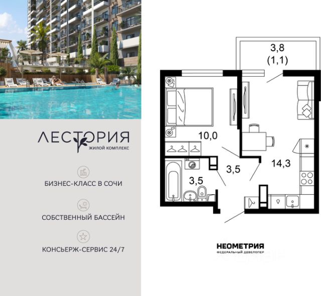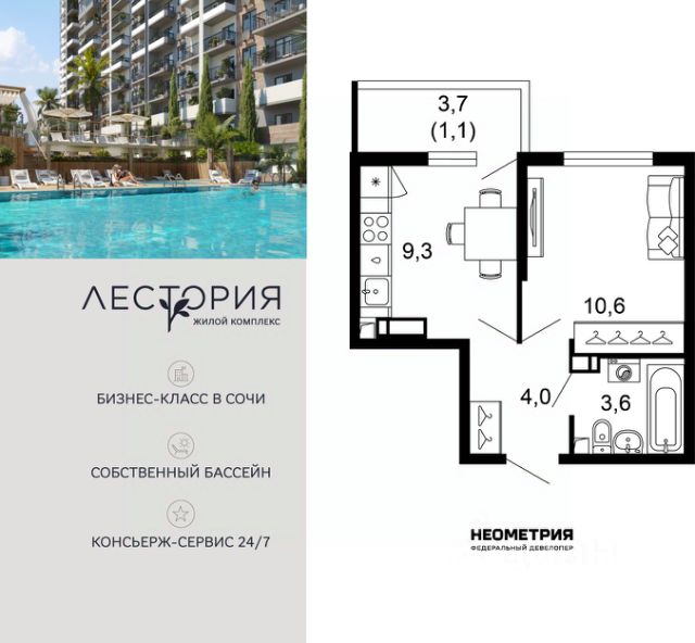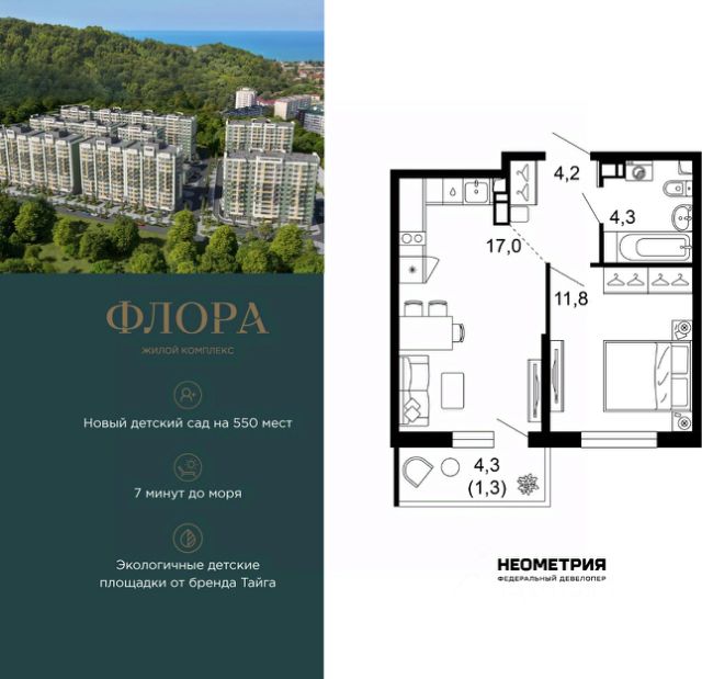 В продаже 1-комнатная квартира, площадью 38.14, расположенная Литер 10 жилого комплекса бизнес-класса "Кислород". Комплекс от девелопера AVA находится в Сочи, на северном склоне горы Бытха, в 7 минутах езды от центра города. Отличная транспортная доступность Остановка автобусов и маршрутных такси - 6 минут пешком, Курортный проспект и пляжи - 10 минут на авто, Эко-парк "Быхта" и туристические тропы - 5 минут пешком, Школы, детские сады, поликлиники, супермаркеты - 5-10 минут на авто, Ж/Д вокзал и центр города - 15 минут на транспорте, Аэропорт - 30 минут на авто. Аккуратный облик домов Жилой комплекс состоит из 15 корпусов высотой 19 этажей. Светлые фасады с голубыми акцентами и архитектурной подсветкой лучше отражают солнце и визуально не перегружают застройку. Благодаря расположению на склоне, из квартир открываются широкие панорамы, в том числе на море и эко-парк. Безопасный двор В комплексе благоустроенная территория организована как безопасное и многофункциональное пространство, где найдется место каждому. Дворы закрыты от автомобилей и прохожих, поэтому здесь тихо и безопасно для детей. На территории предусмотрены игровые площадки для детей разных возрастов, спортивное поле для футбола и баскетбола, а также уличные тренажеры - заниматься спортом можно рядом с домом, без поездок в фитнес-клуб. Для спокойного отдыха предусмотрены зоны со скамейками и прогулочные дорожки по всей территории комплекса. Собственный парк В 5 минутах ходьбы от домов будет благоустроен экологический парк "Бытха" с прогулочными, спортивными, образовательными и экстремальными маршрутами, а также детскими и спортивными площадками. Там можно интересно проводить время с детьми и друзьями, выходить на пробежку или тренировку, гулять и заниматься с питомцем. Преимущества Квартиры европланировок с двумя балконами, гардеробными и видами на несколько сторон света, Подземная, многоуровневая и наземная парковки для автомобилей жителей и гостей, Комфортно не только отдыхать, но и полноценно жить всей семьей: детские сады и школы в 5 минутах, удобная дорогая до города, магазины и сервисы поблизости. Продается 1-комнатная квартира от застройщика в Сочи.