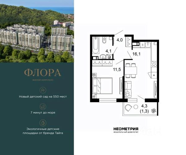 Продается квартира в ЖК "Флора" от федерального девелопера "Неометрия". Это жилой комплекс комфорт-класса в самом зеленом районе Сочи. При проектировании постарались максимально сохранить окружающую флору и фауну. Теплое море, горы, целебные источники, река, близость заповедника все это уже рядом с вами. Жилой комплекс "Флора" это: • 4,5 Га благоустроенной территории от дизайн-бюро Cora * 7 минут до моря на машине • Современные экологичные детские площадки от бренда "Тайга" • Яркие аллеи с цветниками и кустарниками для прогулок и утренних пробежек • Благоустроенная набережная с шезлонгами и перголами • Спортивные зоны для любителей пляжного волейбола, бадминтона и йоги - лапомоечные и колясочные в каждом подъезде - подземный паркинг на 429 мест Собственная управляющая компания с функцией "доверительного управления" Кудепста это прекрасный зеленый оазис, который расположился между историческим центром Сочи и Адлером. Благодаря выгодному местоположению ЖК "Флора" между курортным Адлером и центром Сочи до самых популярных социальных, культурных и развлекательных объектов города можно добраться за считанные минуты: Олимпийский парк. Красная Поляна, аэропорт, жд-вокзал. Кроме того, в шаговой доступности расположена вся необходимая социальная инфраструктура, что удобно для жизни всех членов семьи: • 2 школы; • 3 детских сада; • 3 поликлиники; • 2 фитнес-центра; • 3 магазина и гипермаркета; • спортивная школа • 2 остановки общественного транспорта. На первых этажах комплекса расположены коммерческие помещения пункты выдачи маркетплейсов, кофейни, магазины. В жилом комплексе соблюден принцип сбалансированных и эргономичных планировочных решений: от компактных студий до просторных семейных квартир. В каждой квартире есть балкон, и установлены увеличенные оконные рамы. На 12 этаже повышенной комфортности открываются потрясающие виды на море и национальный парк благодаря панорамному остеклению лоджий. Квартиру можно купить с черновой отделкой или с готовым ремонтом "Прайм", а также с сертификатом на покупку мебели. Приобрести квартиру можно за наличную оплату, в ипотеку, с привлечением средства маткапитала.