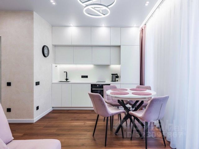 - единая зона гостиной-столовой оборудована высокой кухонной мебелью, индукционной варочной панелью, вытяжкой, духовым шкафом с СВЧ, посудомоечной машиной, большим встроенным холодильником с морозильной камерой, кофемашиной, бесшумным вентилятором и инверторным кондиционером, мягким раскладным диваном, большим телевизором, вместительным комодом, шкафом, обеденным столом и поворотными стульями;