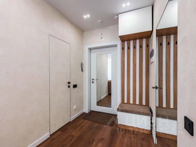- прихожая со встроенным шкафом, двумя высокими зеркалами в дверях, подвесными полками и банкеткой;