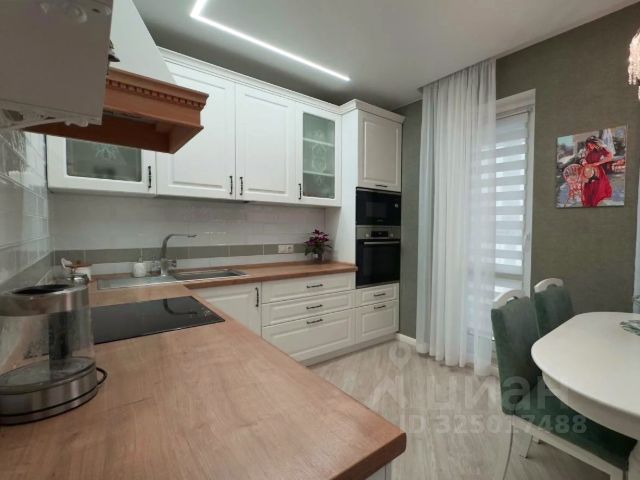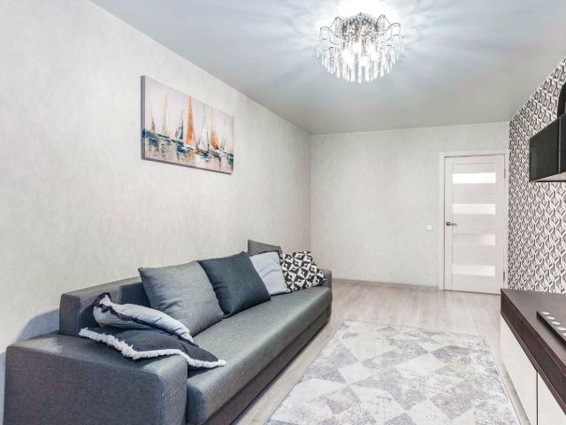 Квартира светлая, в комнате четыре, в кухне две световых точки. Все окна выходят во двор с видом на закрытую прогулочную зону с детской и спортивной площадками, ландшафтным озеленением. Из кухни открывается прекрасный вид на горы.