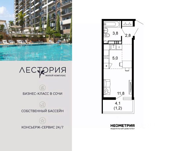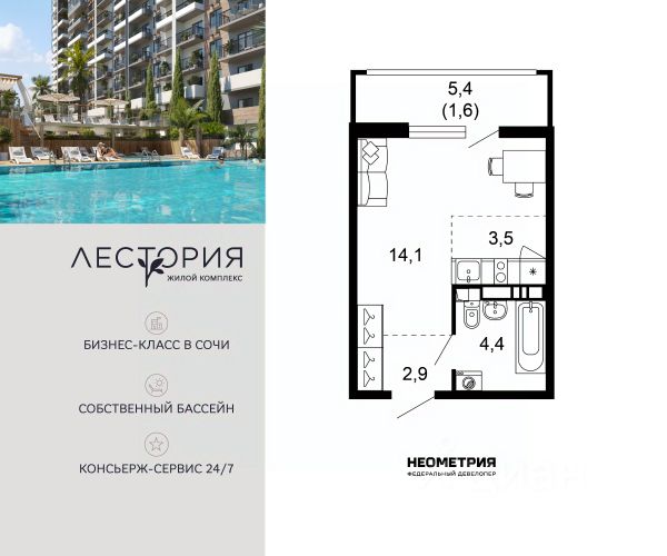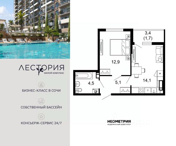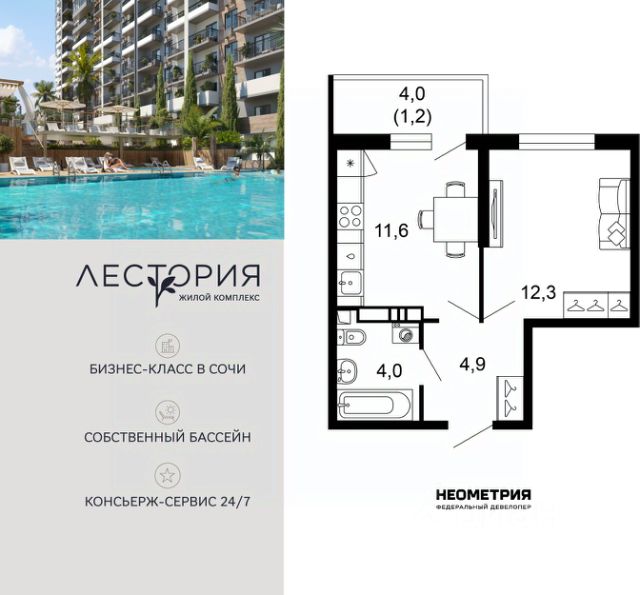Продается квартира в жилом комплексе бизнес-класса "Лестория". В составе ЖК предусмотрена собственная аквазона площадью 473 квадратных метра с двумя подогреваемыми бассейнами, что соответствуют стандартам бизнес-класса. Аквазона объединяет взрослый и детский бассейны. В welcome-zone к услугам посетителей шезлонги и все необходимые принадлежности. Раздевалки с душевыми комнатами, инфракрасная сауна — здесь все предусмотрено для комфортного отдыха и полного расслабления. Для водного комплекса продуман отдельный вход, оборудованный системой контроля и управления доступом (СКУД). Аквазона только часть уникальной инфраструктуры "Лестории", которая включает в себя также благоустроенную территорию с пятьюдесятью функциональными зонами для прогулок, отдыха и занятий спортом, видовые террасы на крышах для отдыха, работы и встреч с друзьями, а также пространство набережной Кудепсты с шезлонгами и перголами. Жилой комплекс "Лестория" состоит из шести домов высотностью от 15 до 17 этажей, окружённых зеленым массивом национального парка. На придомовой территории для жителей предусмотрены закрытые дворы с круглосуточным видеонаблюдением, активити-центр для детей и подростков, тихие зоны для отдыха и медитации. На крышах домов будут созданы зеленые террасы для наслаждения прекрасными видами на море и горы. В проекте предусмотрены разные варианты отделки квартир под потребности покупателей. Тем, кто хочет воплотить в жизнь собственные интерьерные задумки, подойдут квартиры без ремонта. Для комфортной жизни и отдыха в комплексе будет работать круглосуточный консьерж-сервис уровня 5*, который с легкостью закроет все ежедневные потребности: от заказа продуктов и встречи гостей в аэропорту до выгула и дрессировки питомца. К услугам жителей ЖК "Лестория" — собственная управляющая компания, для инвесторов предоставляются услуги доверительного управления. #2Ma9ab