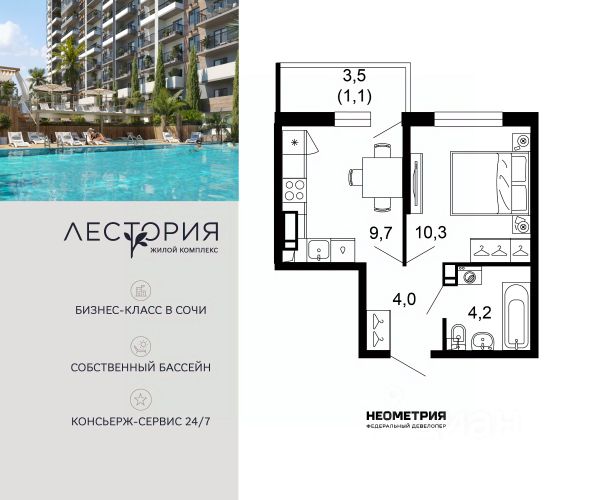 Продается квартира в жилом комплексе бизнес-класса "Лестория". В составе ЖК предусмотрена собственная аквазона площадью 473 квадратных метра с двумя подогреваемыми бассейнами, что соответствуют стандартам бизнес-класса. Аквазона объединяет взрослый и детский бассейны. В welcome-zone к услугам посетителей шезлонги и все необходимые принадлежности. Раздевалки с душевыми комнатами, инфракрасная сауна — здесь все предусмотрено для комфортного отдыха и полного расслабления. Для водного комплекса продуман отдельный вход, оборудованный системой контроля и управления доступом (СКУД). Аквазона только часть уникальной инфраструктуры "Лестории", которая включает в себя также благоустроенную территорию с пятьюдесятью функциональными зонами для прогулок, отдыха и занятий спортом, видовые террасы на крышах для отдыха, работы и встреч с друзьями, а также пространство набережной Кудепсты с шезлонгами и перголами. Жилой комплекс "Лестория" состоит из шести домов высотностью от 15 до 17 этажей, окружённых зеленым массивом национального парка. На придомовой территории для жителей предусмотрены закрытые дворы с круглосуточным видеонаблюдением, активити-центр для детей и подростков, тихие зоны для отдыха и медитации. На крышах домов будут созданы зеленые террасы для наслаждения прекрасными видами на море и горы. В проекте предусмотрены разные варианты отделки квартир под потребности покупателей. Тем, кто хочет воплотить в жизнь собственные интерьерные задумки, подойдут квартиры без ремонта. Для комфортной жизни и отдыха в комплексе будет работать круглосуточный консьерж-сервис уровня 5*, который с легкостью закроет все ежедневные потребности: от заказа продуктов и встречи гостей в аэропорту до выгула и дрессировки питомца. К услугам жителей ЖК "Лестория" — собственная управляющая компания, для инвесторов предоставляются услуги доверительного управления. #z6Ci0b