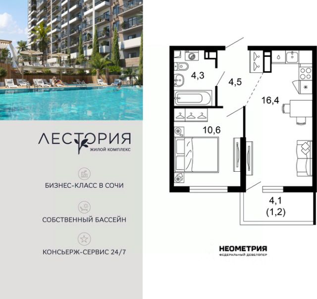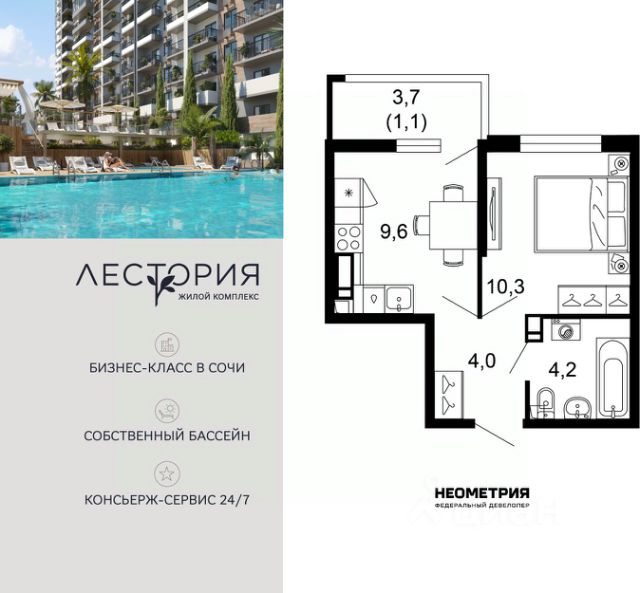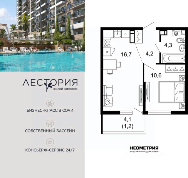 Продается квартира в жилом комплексе бизнес-класса "Лестория". В составе ЖК предусмотрена собственная аквазона площадью 473 квадратных метра с двумя подогреваемыми бассейнами, что соответствуют стандартам бизнес-класса. Аквазона объединяет взрослый и детский бассейны. В welcome-zone к услугам посетителей шезлонги и все необходимые принадлежности. Раздевалки с душевыми комнатами, инфракрасная сауна — здесь все предусмотрено для комфортного отдыха и полного расслабления. Для водного комплекса продуман отдельный вход, оборудованный системой контроля и управления доступом (СКУД). Аквазона только часть уникальной инфраструктуры "Лестории", которая включает в себя также благоустроенную территорию с пятьюдесятью функциональными зонами для прогулок, отдыха и занятий спортом, видовые террасы на крышах для отдыха, работы и встреч с друзьями, а также пространство набережной Кудепсты с шезлонгами и перголами. Жилой комплекс "Лестория" состоит из шести домов высотностью от 15 до 17 этажей, окружённых зеленым массивом национального парка. На придомовой территории для жителей предусмотрены закрытые дворы с круглосуточным видеонаблюдением, активити-центр для детей и подростков, тихие зоны для отдыха и медитации. На крышах домов будут созданы зеленые террасы для наслаждения прекрасными видами на море и горы. В проекте предусмотрены разные варианты отделки квартир под потребности покупателей. Тем, кто хочет воплотить в жизнь собственные интерьерные задумки, подойдут квартиры без ремонта. Для комфортной жизни и отдыха в комплексе будет работать круглосуточный консьерж-сервис уровня 5*, который с легкостью закроет все ежедневные потребности: от заказа продуктов и встречи гостей в аэропорту до выгула и дрессировки питомца. К услугам жителей ЖК "Лестория" — собственная управляющая компания, для инвесторов предоставляются услуги доверительного управления. #2ME7f8