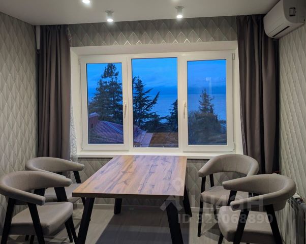 В гостиной выделена обеденная зона с точечным освещением. Из окна открывается красивый вид на море. В этой комнате также расположена кровать с подъёмным механизмом, раскладывающийся диван, телевизор и тумба для него. Шторы с электроприводом открываются с пульта.