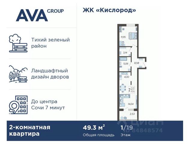 В продаже 2-комнатная квартира, площадью 49.19, расположенная Литер 9 жилого комплекса бизнес-класса "Кислород". Комплекс от девелопера AVA находится в Сочи, на северном склоне горы Бытха, в 7 минутах езды от центра города.