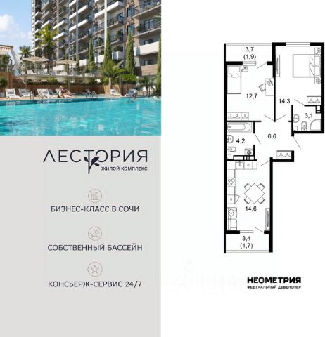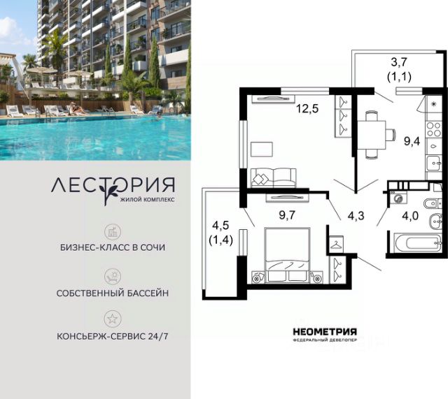 Продается квартира в жилом комплексе бизнес-класса "Лестория". В составе ЖК предусмотрена собственная аквазона площадью 473 квадратных метра с двумя подогреваемыми бассейнами, что соответствуют стандартам бизнес-класса. Аквазона объединяет взрослый и детский бассейны. В welcome-zone к услугам посетителей шезлонги и все необходимые принадлежности. Раздевалки с душевыми комнатами, инфракрасная сауна — здесь все предусмотрено для комфортного отдыха и полного расслабления. Для водного комплекса продуман отдельный вход, оборудованный системой контроля и управления доступом (СКУД). Аквазона только часть уникальной инфраструктуры "Лестории", которая включает в себя также благоустроенную территорию с пятьюдесятью функциональными зонами для прогулок, отдыха и занятий спортом, видовые террасы на крышах для отдыха, работы и встреч с друзьями, а также пространство набережной Кудепсты с шезлонгами и перголами. Жилой комплекс "Лестория" состоит из шести домов высотностью от 15 до 17 этажей, окружённых зеленым массивом национального парка. На придомовой территории для жителей предусмотрены закрытые дворы с круглосуточным видеонаблюдением, активити-центр для детей и подростков, тихие зоны для отдыха и медитации. На крышах домов будут созданы зеленые террасы для наслаждения прекрасными видами на море и горы. В проекте предусмотрены разные варианты отделки квартир под потребности покупателей. Тем, кто хочет воплотить в жизнь собственные интерьерные задумки, подойдут квартиры без ремонта. Для комфортной жизни и отдыха в комплексе будет работать круглосуточный консьерж-сервис уровня 5*, который с легкостью закроет все ежедневные потребности: от заказа продуктов и встречи гостей в аэропорту до выгула и дрессировки питомца. К услугам жителей ЖК "Лестория" — собственная управляющая компания, для инвесторов предоставляются услуги доверительного управления. #2TOSIo