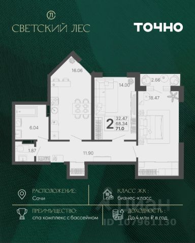 ЖК "Светский лес" — эксклюзивный жилой проект бизнес-класса в Сочи. Это остров цивилизации и технологий в окружении дикой природы национального парка с богатой инфраструктурой, наполненной различными сценариями премиального отдыха и жизни. Общественное пространство жилого комплекса включает в себя прогулочные зоны, спа-комплекс с круглогодичным бассейном, детские и спортивные площадки, велодорожки, собственную набережную реки Сочи, торговую галерею с супермаркетами и ресторанами, а также инновационную школу на 1510 мест и детский сад на 510 мест. Квартира в ЖК "Светский лес" — идеальный вариант как для жизни у моря, так и для инвестиций. Удобный сервис доверительного управления позволит легко зарабатывать на недвижимости в ЖК "Светский лес" до 4 млн. руб. в год.*