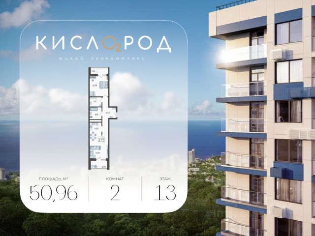 В продаже 2-комнатная квартира, площадью 50.69, расположенная Литер 11 жилого комплекса бизнес-класса "Кислород". Комплекс от девелопера AVA находится в Сочи, на северном склоне горы Бытха, в 7 минутах езды от центра города.