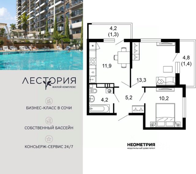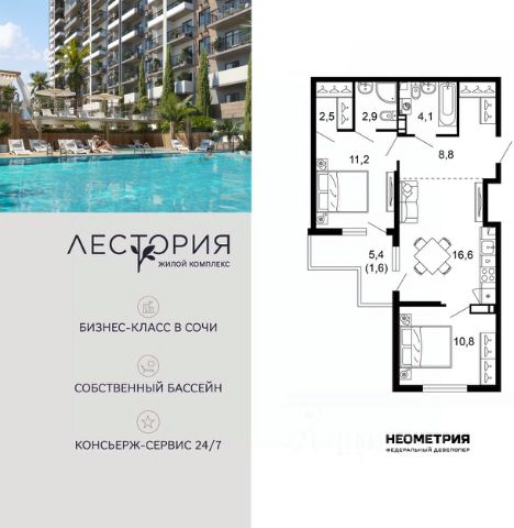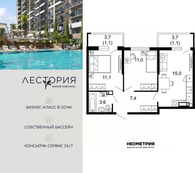 Продается квартира в жилом комплексе бизнес-класса "Лестория". В составе ЖК предусмотрена собственная аквазона площадью 473 квадратных метра с двумя подогреваемыми бассейнами, что соответствуют стандартам бизнес-класса. Аквазона объединяет взрослый и детский бассейны. В welcome-zone к услугам посетителей шезлонги и все необходимые принадлежности. Раздевалки с душевыми комнатами, инфракрасная сауна — здесь все предусмотрено для комфортного отдыха и полного расслабления. Для водного комплекса продуман отдельный вход, оборудованный системой контроля и управления доступом (СКУД). Аквазона только часть уникальной инфраструктуры "Лестории", которая включает в себя также благоустроенную территорию с пятьюдесятью функциональными зонами для прогулок, отдыха и занятий спортом, видовые террасы на крышах для отдыха, работы и встреч с друзьями, а также пространство набережной Кудепсты с шезлонгами и перголами. Жилой комплекс "Лестория" состоит из шести домов высотностью от 15 до 17 этажей, окружённых зеленым массивом национального парка. На придомовой территории для жителей предусмотрены закрытые дворы с круглосуточным видеонаблюдением, активити-центр для детей и подростков, тихие зоны для отдыха и медитации. На крышах домов будут созданы зеленые террасы для наслаждения прекрасными видами на море и горы. В проекте предусмотрены разные варианты отделки квартир под потребности покупателей. Тем, кто хочет воплотить в жизнь собственные интерьерные задумки, подойдут квартиры без ремонта. Для комфортной жизни и отдыха в комплексе будет работать круглосуточный консьерж-сервис уровня 5*, который с легкостью закроет все ежедневные потребности: от заказа продуктов и встречи гостей в аэропорту до выгула и дрессировки питомца. К услугам жителей ЖК "Лестория" — собственная управляющая компания, для инвесторов предоставляются услуги доверительного управления. #2tO5zU