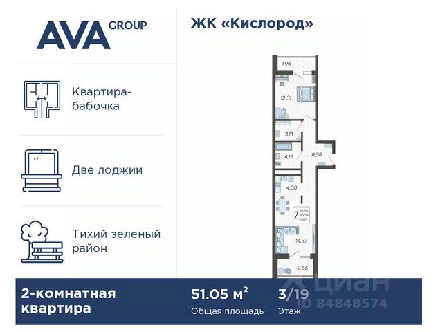 В продаже 2-комнатная квартира, площадью 52.3, расположенная Литер 2 жилого комплекса бизнес-класса "Кислород". Комплекс от девелопера AVA находится в Сочи, на северном склоне горы Бытха, в 7 минутах езды от центра города.