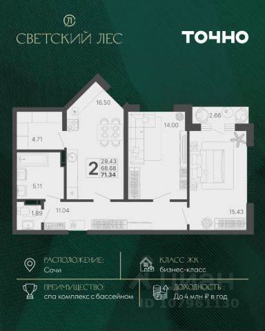 ЖК "Светский лес" — эксклюзивный жилой проект бизнес-класса в Сочи. Это остров цивилизации и технологий в окружении дикой природы национального парка с богатой инфраструктурой, наполненной различными сценариями премиального отдыха и жизни. Общественное пространство жилого комплекса включает инновационную школу на 1510 мест и детский сад на 510 мест. В проекте предусмотрены собственная набережная реки Сочи, прогулочные зоны, спа-комплекс с круглогодичным бассейном, детские и спортивные площадки, велодорожки, а также торговые галереи с супермаркетами и ресторанами. Квартира в ЖК "Светский лес" — идеальный вариант как для жизни у моря, так и для инвестиций. Удобный сервис доверительного управления позволит легко зарабатывать на недвижимости в комплексе до 4 млн. руб. в год.*