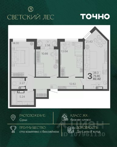 В продаже 2-комнатная квартира площадью 60.4, расположенная Литер 4 жилого комплекса комфорт+ класса "Горный квартал". Комплекс от девелопера AVA находится в Сочи, Хостинского района, в 15 минутах езды от центра города. Отличная транспортная доступность: Остановка маршрутных такси - 5 минут пешком, Барановский виадук - 10 минут на авто, Министерские озера - 2 минуты пешком, Гимназии, детские сады, фитнес-центры, супермаркеты, кинотеатр - 5-10 минут на авто, Ж/Д и автовокзал - 15-20 минут на авто, Адлер - 30 минут на авто, Аэропорт - 45 минут на авто. Аккуратный облик домов Жилой комплекс состоит из пяти корпусов высотой от 10 до 16 этажей. Сдержанные фасады в бежево-серых оттенках выглядят аккуратно и гармонируют с природным окружением, а открытые балконы добавляют облику домов легкости. Контейнеры под кондиционеры встроены в фасады и практически незаметны, благодаря чему дома сохраняют опрятный внешний вид. Комплекс расположен на склоне горы, поэтому из окон квартир на верхних этажах открываются отличные панорамные виды на лес, озеро и город: чем выше этаж, тем выразительнее пейзаж. Двор, где есть место для всех На внутренней территории комплекса всем будет приятно и интересно проводить время в любой сезон. Здесь есть беседки и гамаки под теневыми навесами, что особенно удобно для отдыха в жаркие или дождливые дни. Для активных жителей предусмотрены спортивные площадки и уличные тренажеры, для детей - игровые площадки из натуральных материалов, а для семей и компаний - зона барбекю. Особое преимущество - кинотеатр под открытым небом: формат редкий для жилых комплексов и особенно ценный для совместного семейного досуга прямо рядом с домом. Во всем дворе - ландшафтное озеленение: высажены разнообразные деревья и кустарники, южные цветы и газоны. Природное окружение и идеальная экология Локация особенно понравится тем, кто любит природу и ведет активный образ жизни. Всего в 2 минутах ходьбы находится Нижнее Министерское озеро - отличное место для прогулок и отдыха. Поблизости расположены природные достопримечательности южного побережья, включая Черепашье озеро и дольмены, куда интересно ходить в походы или выезжать на выходные. До общественных и санаторных пляжей можно добраться за 20 минут на автомобиле. Благодаря хвойному лесу и мягкому морскому бризу здесь всегда чистый воздух, а ночами видно звездное небо, что подчеркивает горный характер места и создает редкое ощущение тишины и уюта для Сочи. Дополнительные преимущества Видовые квартиры с окнами на три стороны света и семейные форматы с тремя спальнями, двумя ванными и отдельной кухней; Наземный паркинг для жителей и гостей на 815 машиномест, На первых этажах домов работают магазины, рестораны и салоны красоты, к которым можно спуститься на лифте, Комфортно не только отдыхать, но и полноценно жить всей семьей: гимназии в 10 минутах езды, удобная дорогая до города, магазины и сервисы поблизости.