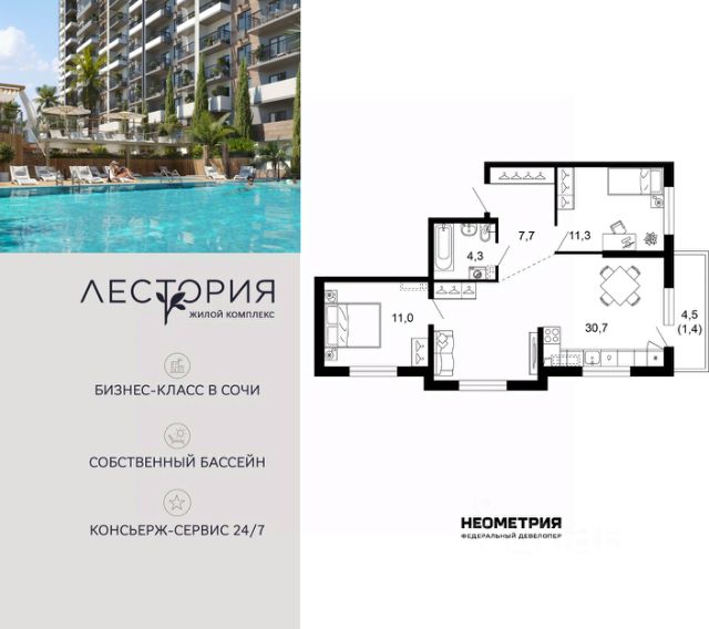 Так же на территории апартаментного комплекса "Моне" находится открытый подогреваемый бассейн площадью 400м2. Бассейн имеет детскую зону, что высоко оценят гости наших апартаментов, которые будут приезжать на отдых с детьми.