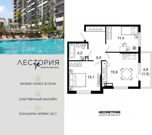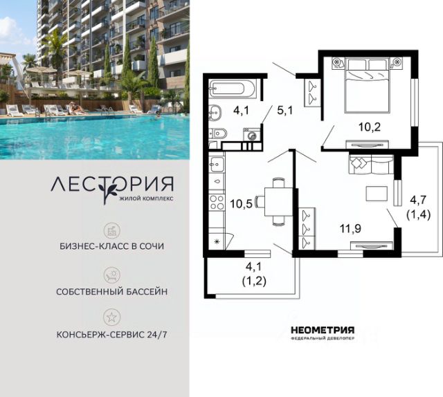 Продается квартира в жилом комплексе бизнес-класса "Лестория". В составе ЖК предусмотрена собственная аквазона площадью 473 квадратных метра с двумя подогреваемыми бассейнами, что соответствуют стандартам бизнес-класса. Аквазона объединяет взрослый и детский бассейны. В welcome-zone к услугам посетителей шезлонги и все необходимые принадлежности. Раздевалки с душевыми комнатами, инфракрасная сауна — здесь все предусмотрено для комфортного отдыха и полного расслабления. Для водного комплекса продуман отдельный вход, оборудованный системой контроля и управления доступом (СКУД). Аквазона только часть уникальной инфраструктуры "Лестории", которая включает в себя также благоустроенную территорию с пятьюдесятью функциональными зонами для прогулок, отдыха и занятий спортом, видовые террасы на крышах для отдыха, работы и встреч с друзьями, а также пространство набережной Кудепсты с шезлонгами и перголами. Жилой комплекс "Лестория" состоит из шести домов высотностью от 15 до 17 этажей, окружённых зеленым массивом национального парка. На придомовой территории для жителей предусмотрены закрытые дворы с круглосуточным видеонаблюдением, активити-центр для детей и подростков, тихие зоны для отдыха и медитации. На крышах домов будут созданы зеленые террасы для наслаждения прекрасными видами на море и горы. В проекте предусмотрены разные варианты отделки квартир под потребности покупателей. Тем, кто хочет воплотить в жизнь собственные интерьерные задумки, подойдут квартиры без ремонта. Для комфортной жизни и отдыха в комплексе будет работать круглосуточный консьерж-сервис уровня 5*, который с легкостью закроет все ежедневные потребности: от заказа продуктов и встречи гостей в аэропорту до выгула и дрессировки питомца. К услугам жителей ЖК "Лестория" — собственная управляющая компания, для инвесторов предоставляются услуги доверительного управления.