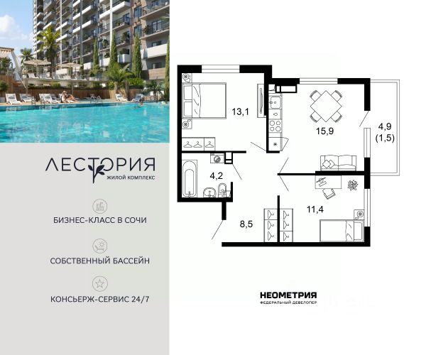 Проект включает в себя 7 жилых корпусов высотой 12 этажей. В подъездах выполнена дизайнерская отделка в светлой цветовой гамме с яркими акцентами, для удобства жителей в местах общего пользования предусмотрена навигация. В каждой секции предусмотрены помещения для хранения велосипедов и колясок с обустроенным местом для мойки колес и лап домашних животных. Покупателям в ЖК предложено множество планировочных решений: в наличии квартиры, как классического типа, так и европланировки. Из окон открываются виды на реку и горы. Квартиры сдаются без отделки. В состав комплекса входит школа на 2 000 мест, детский сад на 550 мест и фитнес-центр. На первых этажах расположены коммерческие помещения. Во дворах установлены детские площадки, спортивные комплексы и деревянные беседки для отдыха. По периметру ЖК ведется видеонаблюдение, к которому можно подключится online при помощи специального приложения для мобильных устройств. Рядом с комплексом располагается благоустроенная набережная реки Кудепста. Комплекс расположен в микрорайоне Кудепста города Сочи. В окрестностях района находится большая плантация пробкового дуба. В пешей доступности есть школы, детские сады, магазины, медучреждения, салоны красоты и места для отдыха. Комплекс расположен в 1,9 км от моря, и 7 км до Сочи.