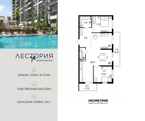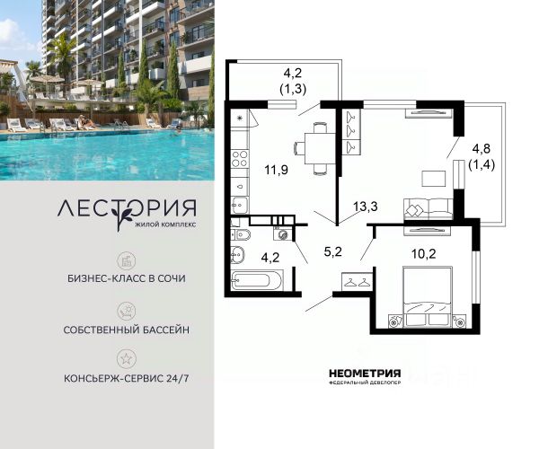 Проект включает в себя 7 жилых корпусов высотой 12 этажей. В подъездах выполнена дизайнерская отделка в светлой цветовой гамме с яркими акцентами, для удобства жителей в местах общего пользования предусмотрена навигация. В каждой секции предусмотрены помещения для хранения велосипедов и колясок с обустроенным местом для мойки колес и лап домашних животных. Покупателям в ЖК предложено множество планировочных решений: в наличии квартиры, как классического типа, так и европланировки. Из окон открываются виды на реку и горы. Квартиры сдаются без отделки. В состав комплекса входит школа на 2 000 мест, детский сад на 550 мест и фитнес-центр. На первых этажах расположены коммерческие помещения. Во дворах установлены детские площадки, спортивные комплексы и деревянные беседки для отдыха. По периметру ЖК ведется видеонаблюдение, к которому можно подключится online при помощи специального приложения для мобильных устройств. Рядом с комплексом располагается благоустроенная набережная реки Кудепста. Комплекс расположен в микрорайоне Кудепста города Сочи. В окрестностях района находится большая плантация пробкового дуба. В пешей доступности есть школы, детские сады, магазины, медучреждения, салоны красоты и места для отдыха. Комплекс расположен в 1,9 км от моря, и 7 км до Сочи.