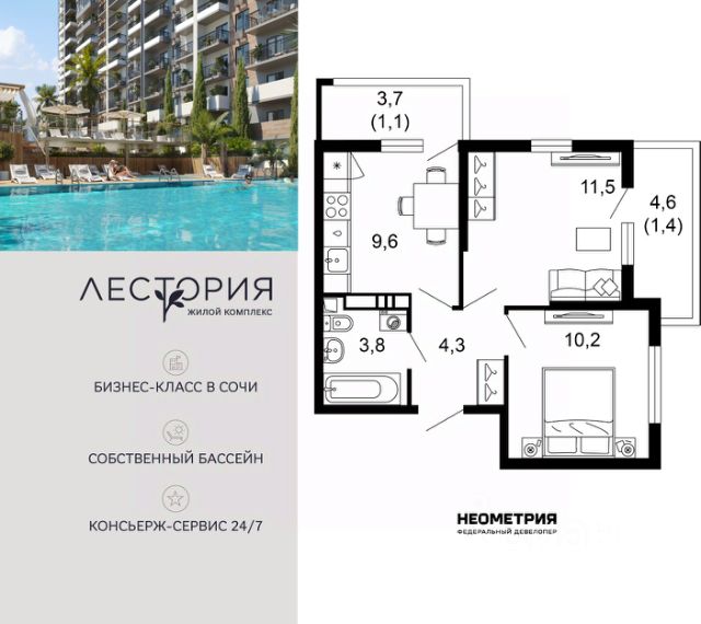Продается квартира в жилом комплексе бизнес-класса "Лестория". В составе ЖК предусмотрена собственная аквазона площадью 473 квадратных метра с двумя подогреваемыми бассейнами, что соответствуют стандартам бизнес-класса. Аквазона объединяет взрослый и детский бассейны. В welcome-zone к услугам посетителей шезлонги и все необходимые принадлежности. Раздевалки с душевыми комнатами, инфракрасная сауна — здесь все предусмотрено для комфортного отдыха и полного расслабления. Для водного комплекса продуман отдельный вход, оборудованный системой контроля и управления доступом (СКУД). Аквазона только часть уникальной инфраструктуры "Лестории", которая включает в себя также благоустроенную территорию с пятьюдесятью функциональными зонами для прогулок, отдыха и занятий спортом, видовые террасы на крышах для отдыха, работы и встреч с друзьями, а также пространство набережной Кудепсты с шезлонгами и перголами. Жилой комплекс "Лестория" состоит из шести домов высотностью от 15 до 17 этажей, окружённых зеленым массивом национального парка. На придомовой территории для жителей предусмотрены закрытые дворы с круглосуточным видеонаблюдением, активити-центр для детей и подростков, тихие зоны для отдыха и медитации. На крышах домов будут созданы зеленые террасы для наслаждения прекрасными видами на море и горы. В проекте предусмотрены разные варианты отделки квартир под потребности покупателей. Тем, кто хочет воплотить в жизнь собственные интерьерные задумки, подойдут квартиры без ремонта. Для комфортной жизни и отдыха в комплексе будет работать круглосуточный консьерж-сервис уровня 5*, который с легкостью закроет все ежедневные потребности: от заказа продуктов и встречи гостей в аэропорту до выгула и дрессировки питомца. К услугам жителей ЖК "Лестория" — собственная управляющая компания, для инвесторов предоставляются услуги доверительного управления.