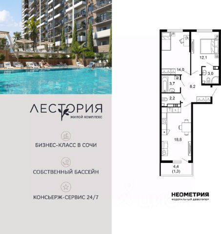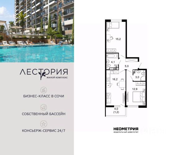 Продается квартира в жилом комплексе бизнес-класса "Лестория". В составе ЖК предусмотрена собственная аквазона площадью 473 квадратных метра с двумя подогреваемыми бассейнами, что соответствуют стандартам бизнес-класса. Аквазона объединяет взрослый и детский бассейны. В welcome-zone к услугам посетителей шезлонги и все необходимые принадлежности. Раздевалки с душевыми комнатами, инфракрасная сауна — здесь все предусмотрено для комфортного отдыха и полного расслабления. Для водного комплекса продуман отдельный вход, оборудованный системой контроля и управления доступом (СКУД). Аквазона только часть уникальной инфраструктуры "Лестории", которая включает в себя также благоустроенную территорию с пятьюдесятью функциональными зонами для прогулок, отдыха и занятий спортом, видовые террасы на крышах для отдыха, работы и встреч с друзьями, а также пространство набережной Кудепсты с шезлонгами и перголами. Жилой комплекс "Лестория" состоит из шести домов высотностью от 15 до 17 этажей, окружённых зеленым массивом национального парка. На придомовой территории для жителей предусмотрены закрытые дворы с круглосуточным видеонаблюдением, активити-центр для детей и подростков, тихие зоны для отдыха и медитации. На крышах домов будут созданы зеленые террасы для наслаждения прекрасными видами на море и горы. В проекте предусмотрены разные варианты отделки квартир под потребности покупателей. Тем, кто хочет воплотить в жизнь собственные интерьерные задумки, подойдут квартиры без ремонта. Для комфортной жизни и отдыха в комплексе будет работать круглосуточный консьерж-сервис уровня 5*, который с легкостью закроет все ежедневные потребности: от заказа продуктов и встречи гостей в аэропорту до выгула и дрессировки питомца. К услугам жителей ЖК "Лестория" — собственная управляющая компания, для инвесторов предоставляются услуги доверительного управления. #27OWFu