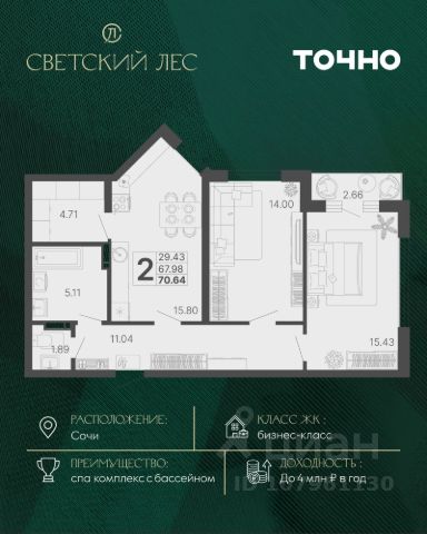 ЖК "Светский лес" — эксклюзивный жилой проект бизнес-класса в Сочи. Это остров цивилизации и технологий в окружении дикой природы национального парка с богатой инфраструктурой, наполненной различными сценариями премиального отдыха и жизни. Общественное пространство жилого комплекса включает инновационную школу на 1510 мест и детский сад на 510 мест. В проекте предусмотрены собственная набережная реки Сочи, прогулочные зоны, спа-комплекс с круглогодичным бассейном, детские и спортивные площадки, велодорожки, а также торговые галереи с супермаркетами и ресторанами. Квартира в ЖК "Светский лес" — идеальный вариант как для жизни у моря, так и для инвестиций. Удобный сервис доверительного управления позволит легко зарабатывать на недвижимости в комплексе до 4 млн. руб. в год.*
