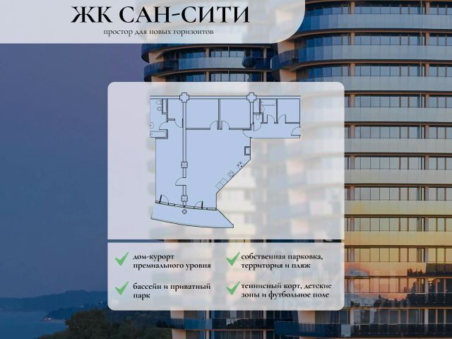 Дом-курорт премиального уровня в Хостинском районе Сочи с собственной парковкой, территорией и пляжем. Тщательно продуманные планировочные решения, собственный бассейн и даже приватный парк. "Сан-Сити" — авторский проект, один из самых высоких домов Краснодарского края с эффектным двуобъемным фасадом и панорамными окнами, из которых открываются красивые виды на горы и море. Наслаждайтесь приятным сочинским солнцем в уединении. Жилой комплекс Сан-Сити обладает собственным пляжем, поэтому вы можете не опасаться любопытных глаз и никто не потревожит ваш отдых. На территории комплекса расположились: теннисный корт, мини футбольное поле, площадка WORKOUT, детские игровые зоны, а также зона барбекю для отдыха взрослого населения. Территория комплекса огорожена и охраняется Продам 2-комнатную квартиру в ипотеку в микрорайоне Приморье в городе Сочи.