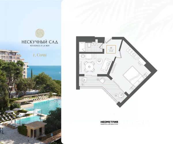 Нескучный сад Rsidences la mer — авторский курорт с атмосферой французской Ривьеры, где каждый день как увлекательное путешествие. Курортный комплекс Нескучный сад создан для тех, кто путешествует по миру в поисках идеального места, где можно замедлиться, ощутить жизнь всеми органами чувств, чувствовать заботу и премиальный сервис. Неометрия создала подобное пространство здесь — в сердце Сочи. Премиальный курорт имеет официальный статус пятизвездочного отеля, реализуется по ФЗ-214 с использованием эскроу-счетов. Состоит из многоуровневой приватной территории 4,5 га, пяти садов чувств, уникального парящего променада 1,3 га, ведущего к морю, и собственного концептуального пляжа. Камерная локация Курорт расположен в Адлерском районе Центрального Сочи, между морем и горами. Место выбрано не случайно и подчеркивает ценность замедления в центре динамичной жизни. Чтобы оградить вас от шума и суеты, Нескучный сад скрыт в объятиях реликтового парка. Находясь в сердце золотого треугольника Сочи - 10 минутах до международного аэропорта, 15 минутах до Олимпийского парка и 45 минутах до Горнолыжного курорта Роза Хутор и Красной Поляны, вы получаете долгожданную приватность и ощущение загородной жизни. Прогулка до собственного пляжа - 450 шагов незабываемых ощущений по уникальному парящему променаду между верхушек пицундских сосен и платанов. В вашем распоряжении инфраструктура собственного курорта Каждая деталь в Rsidences la mer продумана и настроена на волну удовольствий: пул концептуальных ресторанов, подогреваемые бассейны, два уровня wellness & SPA, детские плей хабы и развивающий центр, воркауты в окружении зелени и деловой-кластер делают Нескучный сад достойным выбором для самой взыскательной аудитории. Безукоризненный сервис пятизвездочного отеля Попадая в Нескучный сад, ощущаешь себя гостем фешенебельного отеля valet parking, cleaning Focus, деликатный консьерж-сервис освобождает от рутины, фрахтует яхты для морской прогулки, электронно регистрирует ваших гостей, рекомендует лучшие маршруты путешествий для знакомства с аутентичной культурой, локальной гастрономией, легендами и традициями Сочи, забронирует лучший столик в одном из ресторанов. Любимые блюда прямо в вашу резиденцию доставит flashbot робот. Личныи помощник предугадывает желания и заботится о том, чтобы вы отдыхали, а ваши активы росли.