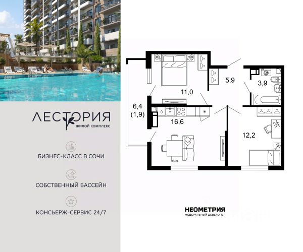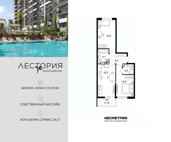 Продается квартира в жилом комплексе бизнес-класса "Лестория". В составе ЖК предусмотрена собственная аквазона площадью 473 квадратных метра с двумя подогреваемыми бассейнами, что соответствуют стандартам бизнес-класса. Аквазона объединяет взрослый и детский бассейны. В welcome-zone к услугам посетителей шезлонги и все необходимые принадлежности. Раздевалки с душевыми комнатами, инфракрасная сауна — здесь все предусмотрено для комфортного отдыха и полного расслабления. Для водного комплекса продуман отдельный вход, оборудованный системой контроля и управления доступом (СКУД). Аквазона только часть уникальной инфраструктуры "Лестории", которая включает в себя также благоустроенную территорию с пятьюдесятью функциональными зонами для прогулок, отдыха и занятий спортом, видовые террасы на крышах для отдыха, работы и встреч с друзьями, а также пространство набережной Кудепсты с шезлонгами и перголами. Жилой комплекс "Лестория" состоит из шести домов высотностью от 15 до 17 этажей, окружённых зеленым массивом национального парка. На придомовой территории для жителей предусмотрены закрытые дворы с круглосуточным видеонаблюдением, активити-центр для детей и подростков, тихие зоны для отдыха и медитации. На крышах домов будут созданы зеленые террасы для наслаждения прекрасными видами на море и горы. В проекте предусмотрены разные варианты отделки квартир под потребности покупателей. Тем, кто хочет воплотить в жизнь собственные интерьерные задумки, подойдут квартиры без ремонта. Для комфортной жизни и отдыха в комплексе будет работать круглосуточный консьерж-сервис уровня 5*, который с легкостью закроет все ежедневные потребности: от заказа продуктов и встречи гостей в аэропорту до выгула и дрессировки питомца. К услугам жителей ЖК "Лестория" — собственная управляющая компания, для инвесторов предоставляются услуги доверительного управления.